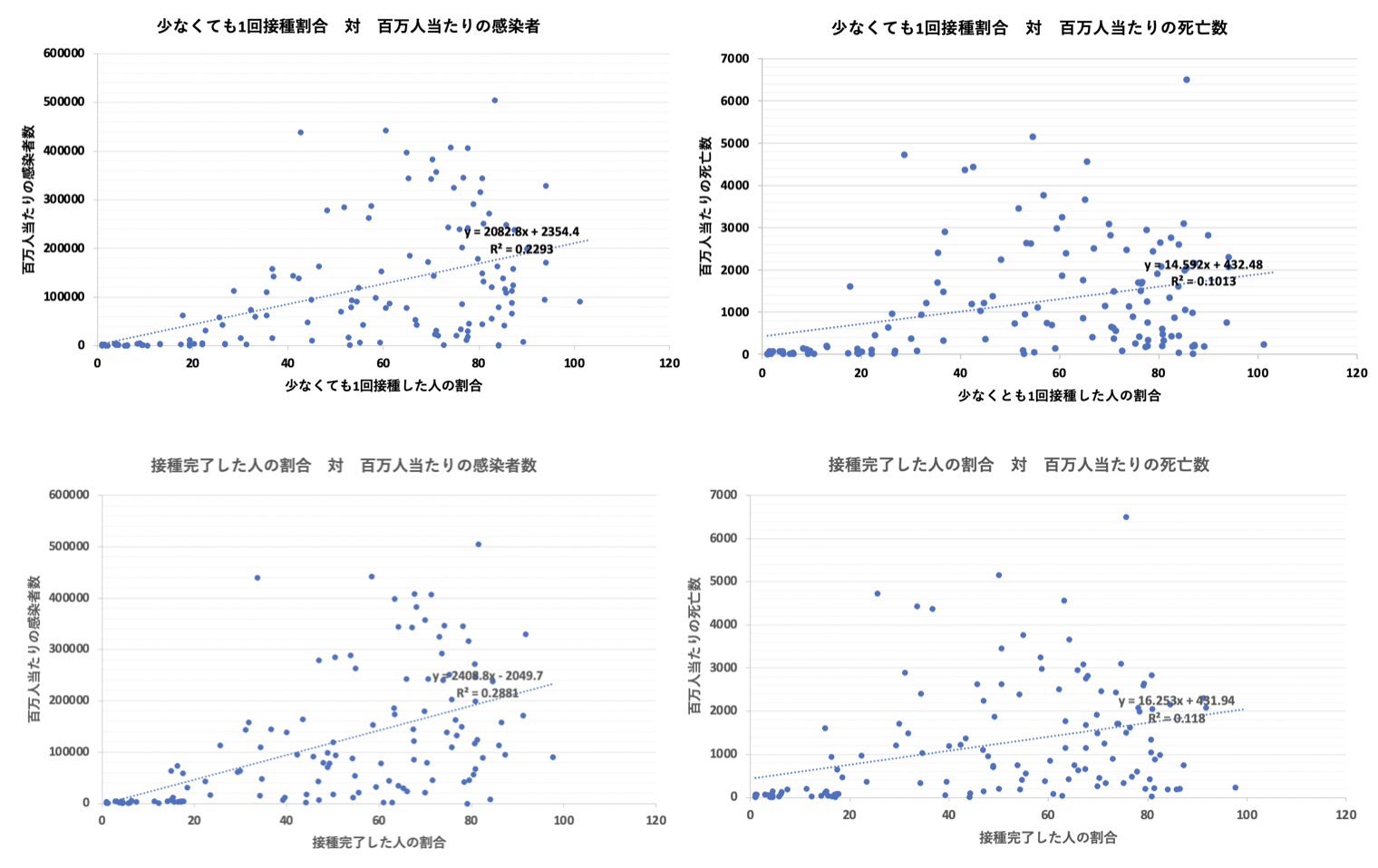 新型コロナワクチン接種でも、同様の逆効果のため、ワクチンの接種によって感染率・死亡率が高くなると考えられます。(新型コロナワクチンの危険性)世界131カ国のワクチン接種率と感染率・死亡率の関係。