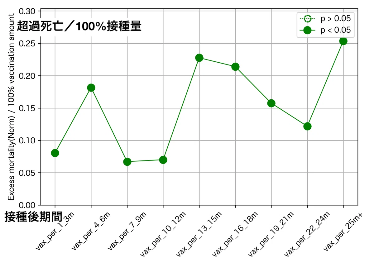 下図のように、結果は新型コロナワクチン接種量と超過死亡率の間に明らかな正の相関を示し、その効果は時間の経過とともに増加する傾向になった。(2026, Ken)